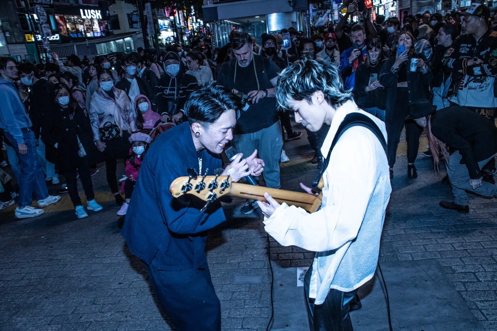 夜の渋谷での路上ライブでは多くの注目を集めていた